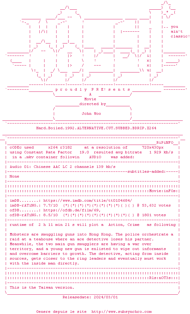 Y avez-vous pense ? Nous proposons déjà 6 sous-titres pour le film À toute épreuve / Hard Boiled. Avez-vous essaye de voir si ces sous-titres etaient compatibles avec cette release ? On vous laisse le soin de tester cela pour nous et de contribuer au site en postant le sous-titre en cas de compatiblite constatee !