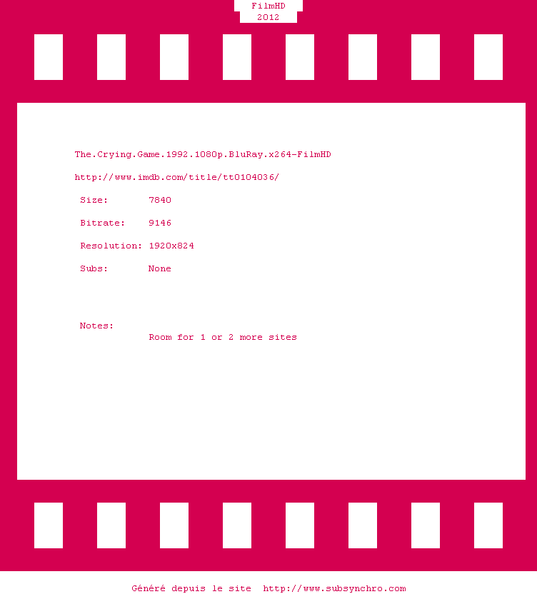 Y avez-vous pense ? Nous proposons déjà 5 sous-titres pour le film The Crying Game. Avez-vous essaye de voir si ces sous-titres etaient compatibles avec cette release ? On vous laisse le soin de tester cela pour nous et de contribuer au site en postant le sous-titre en cas de compatiblite constatee !