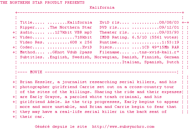NFO de Kalifornia.1993.iNTERNAL.XviDVD-TNS