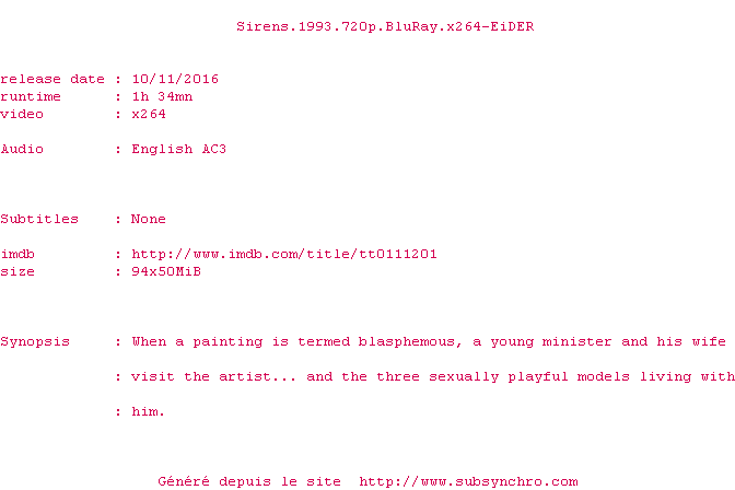 Sirens.1993.x264.eider.srt Ajouté par Membre désactivé Ajoute le 27-11-2016 17:44:24 Format : SRT Italique : Non Taille : 0.00Ko Telechargement : 34 Sous-titre Extrait d'un DVD Z2 OCR par s-t.eu Ajouter cette release à ma collection en cas de telechargement des sous-titres 0 0 0 Telecharger le ZiP contenant NFO, Affiche, Sous-titre (*.srt) Commentez le fichier Sirens.1993.x264.eider.srt Commentez le fichier Sirens.1993.x264.eider.srt Commentez ce fichier Le fichier 10740-1480265064.srt n'existe pas ! Telechargez le RSS « Fichier de la release Sirens.1993.720p.BluRay.x264-EiDER » Retour a la release « Sirens.1993.720p.BluRay.x264-EiDER »