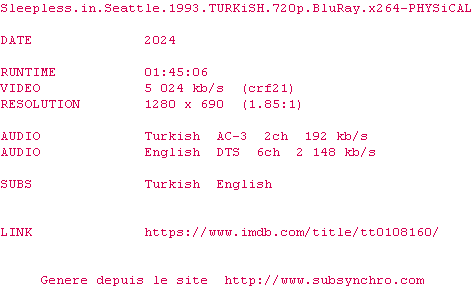 Y avez-vous pense ? Nous proposons déjà 3 sous-titres pour le film Nuits blanches à Seattle. Avez-vous essaye de voir si ces sous-titres etaient compatibles avec cette release ? On vous laisse le soin de tester cela pour nous et de contribuer au site en postant le sous-titre en cas de compatiblite constatee !