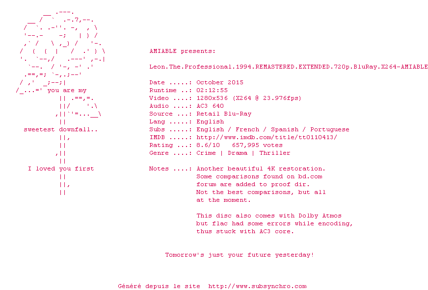 Y avez-vous pense ? Nous proposons déjà 11 sous-titres pour le film Léon. Avez-vous essaye de voir si ces sous-titres etaient compatibles avec cette release ? On vous laisse le soin de tester cela pour nous et de contribuer au site en postant le sous-titre en cas de compatiblite constatee !