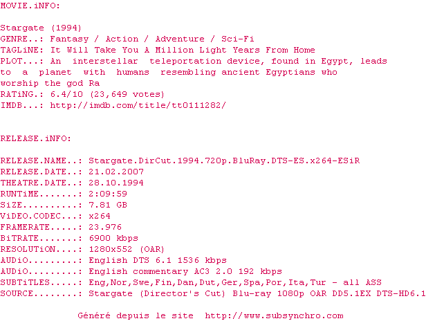Stargate.1994.Extended.Cut.Bluray.1080p.DTSHD7.1.x264.dxva-FraMeSToR.srt Ajouté par Inco Ajoute le 02-04-2010 14:04:19 Format : SRT Italique : Non Taille : 0.00Ko Telechargement : 382 Ajouter cette release à ma collection en cas de telechargement des sous-titres 0 0 0 Telecharger le ZiP contenant NFO, Affiche, Sous-titre (*.srt) Commentez le fichier Stargate.1994.Extended.Cut.Bluray.1080p.DTSHD7.1.x264.dxva-FraMeSToR.srt Commentez le fichier Stargate.1994.Extended.Cut.Bluray.1080p.DTSHD7.1.x264.dxva-FraMeSToR.srt Commentez ce fichier Le fichier 437-1270209859.srt n'existe pas ! Telechargez le RSS « Fichier de la release Stargate.DirCut.1994.720p.BluRay.DTS-ES.x264-ESiR » Retour a la release « Stargate.DirCut.1994.720p.BluRay.DTS-ES.x264-ESiR »