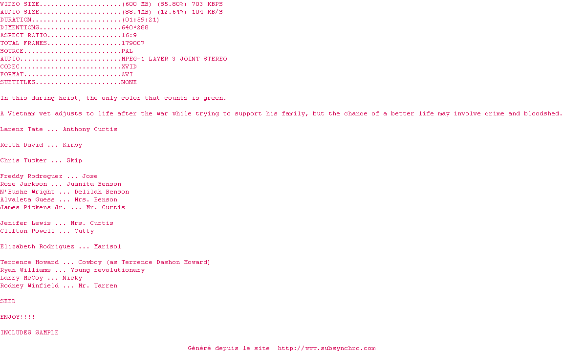 Dead.Presidents.DVDRIP.XVID.1995-KNIGHTY1973.srt Ajouté par Ultimhate Ajoute le 18-12-2010 23:02:58 Format : SRT Italique : Non Taille : 0.00Ko Telechargement : 105 Ajouter cette release à ma collection en cas de telechargement des sous-titres 0 0 0 Telecharger le ZiP contenant NFO, Affiche, Sous-titre (*.srt) Commentez le fichier Dead.Presidents.DVDRIP.XVID.1995-KNIGHTY1973.srt Commentez le fichier Dead.Presidents.DVDRIP.XVID.1995-KNIGHTY1973.srt Commentez ce fichier Le fichier 138-1292709803.srt n'existe pas ! Telechargez le RSS « Fichier de la release Dead.Presidents.DVDRIP.XVID.1995-KNIGHTY1973 » Retour au film « Génération sacrifiée »