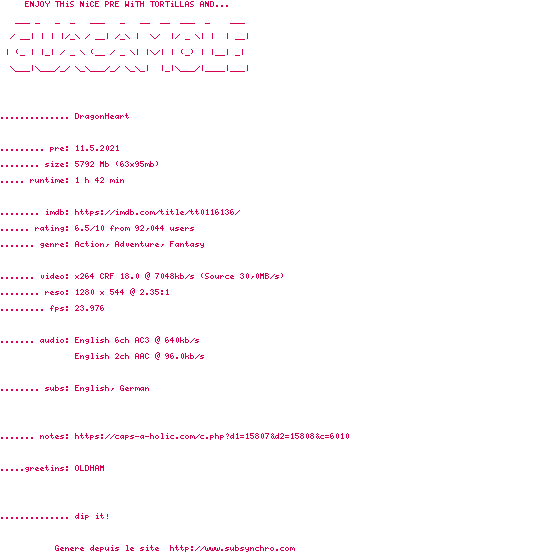 Y avez-vous pense ? Nous proposons déjà 5 sous-titres pour le film CÅ“ur de dragon. Avez-vous essaye de voir si ces sous-titres etaient compatibles avec cette release ? On vous laisse le soin de tester cela pour nous et de contribuer au site en postant le sous-titre en cas de compatiblite constatee !