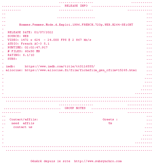Telechargez le RSS « Fichier de la release Hommes.Femmes.Mode.D.Emploi.1996.FRENCH.720p.WEB.H264-SEiGHT »