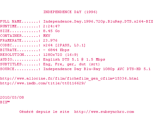 Independence.Day.1996.720p.BluRay.DTS.x264-BIX.srt Ajouté par XeiS Ajoute le 15-06-2010 17:51:52 Format : SRT Italique : Non Taille : 0.00Ko Telechargement : 174 Ajouter cette release à ma collection en cas de telechargement des sous-titres 0 0 0 Telecharger le ZiP contenant NFO, Affiche, Sous-titre (*.srt) Commentez le fichier Independence.Day.1996.720p.BluRay.DTS.x264-BIX.srt Commentez le fichier Independence.Day.1996.720p.BluRay.DTS.x264-BIX.srt Commentez ce fichier Le fichier 52-1276617112.srt n'existe pas ! Telechargez le RSS « Fichier de la release Independence.Day.1996.720p.BluRay.DTS.x264-BIX » Retour a la release « Independence.Day.1996.720p.BluRay.DTS.x264-BIX »