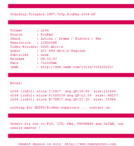 Starship.Troopers.1997.720p.BluRay.x264-hV.srt Ajouté par XeiS Ajoute le 07-02-2010 21:43:12 Format : SRT Italique : Non Taille : 0.00Ko Telechargement : 196 Ajouter cette release à ma collection en cas de telechargement des sous-titres 0 0 0 Telecharger le ZiP contenant NFO, Affiche, Sous-titre (*.srt) Commentez le fichier Starship.Troopers.1997.720p.BluRay.x264-hV.srt Commentez le fichier Starship.Troopers.1997.720p.BluRay.x264-hV.srt Commentez ce fichier Le fichier 52-1265575392.srt n'existe pas ! Telechargez le RSS « Fichier de la release Starship.Troopers.1997.720p.BluRay.x264-hV » Retour au film « Starship Troopers »