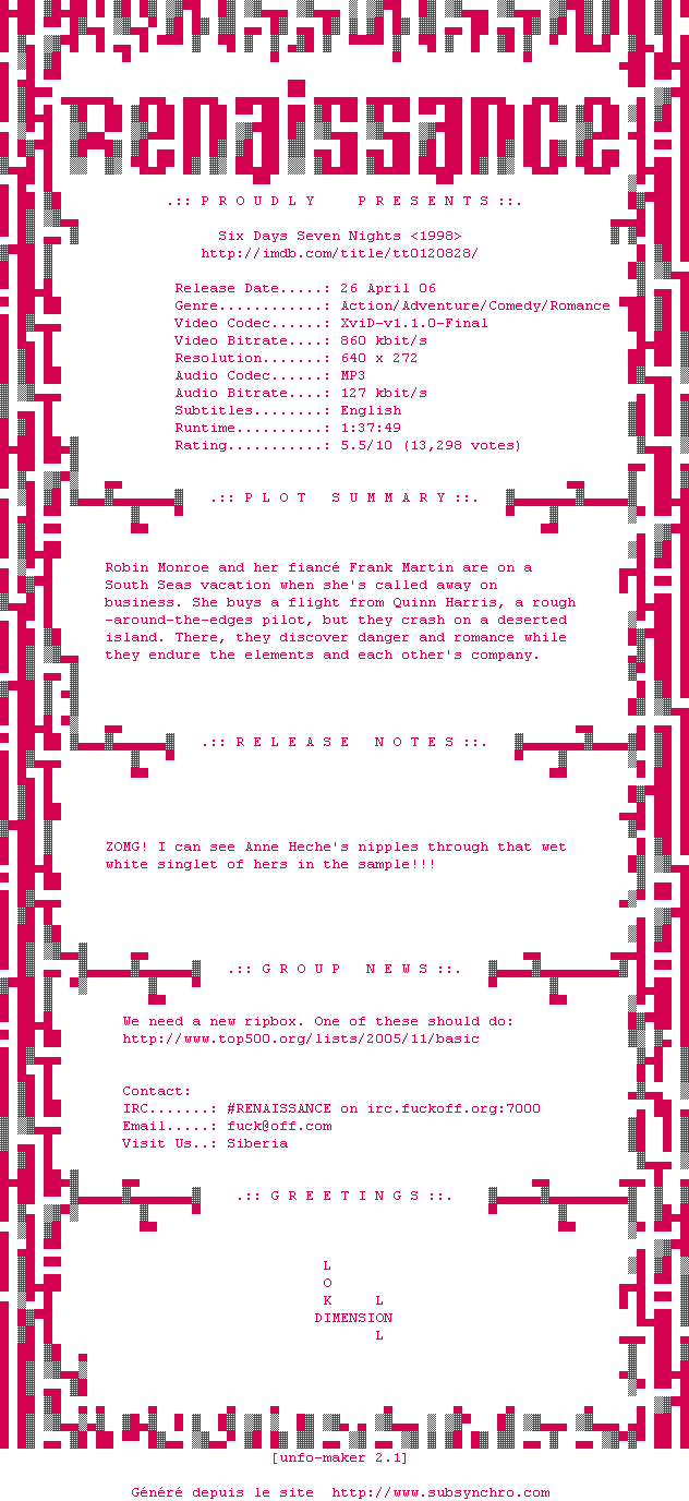 Six.Days.Seven.Nights.1998.DVDRip.XviD-RENAISSANCE.srt Ajouté par Ultimhate Ajoute le 25-12-2011 19:38:19 Format : SRT Italique : Non Taille : 0.00Ko Telechargement : 160 Ajouter cette release à ma collection en cas de telechargement des sous-titres 0 0 0 Telecharger le ZiP contenant NFO, Affiche, Sous-titre (*.srt) Commentez le fichier Six.Days.Seven.Nights.1998.DVDRip.XviD-RENAISSANCE.srt Commentez le fichier Six.Days.Seven.Nights.1998.DVDRip.XviD-RENAISSANCE.srt Commentez ce fichier Le fichier 138-1324838317.srt n'existe pas ! Telechargez le RSS « Fichier de la release Six.Days.Seven.Nights.1998.DVDRip.XviD-RENAISSANCE » Retour a la release « Six.Days.Seven.Nights.1998.DVDRip.XviD-RENAISSANCE »