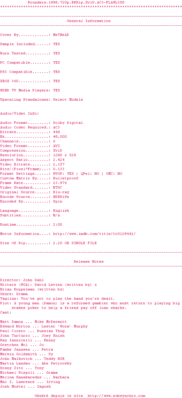 Rounders.1998.720p.BRRip.XviD.AC3-FLAWL3SS.srt Ajouté par XeiS Ajoute le 16-02-2010 10:37:21 Format : SRT Italique : Non Taille : 0.00Ko Telechargement : 104 Ajouter cette release à ma collection en cas de telechargement des sous-titres 0 0 0 Telecharger le ZiP contenant NFO, Affiche, Sous-titre (*.srt) Commentez le fichier Rounders.1998.720p.BRRip.XviD.AC3-FLAWL3SS.srt Commentez le fichier Rounders.1998.720p.BRRip.XviD.AC3-FLAWL3SS.srt Commentez ce fichier Le fichier 52-1266313041.srt n'existe pas ! Telechargez le RSS « Fichier de la release Rounders.1998.720p.BRRip.XviD.AC3-FLAWL3SS » Retour au film « Les Joueurs »