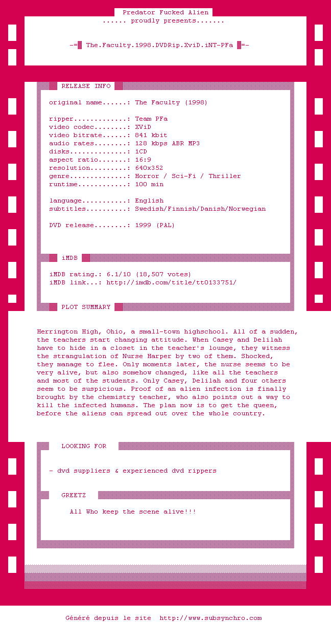 The.Faculty.1998.DVDRip.XviD.iNT-PFa.srt Ajouté par XeiS Ajoute le 17-02-2010 17:27:49 Format : SRT Italique : Non Taille : 0.00Ko Telechargement : 149 Ajouter cette release à ma collection en cas de telechargement des sous-titres 0 0 0 Telecharger le ZiP contenant NFO, Affiche, Sous-titre (*.srt) Commentez le fichier The.Faculty.1998.DVDRip.XviD.iNT-PFa.srt Commentez le fichier The.Faculty.1998.DVDRip.XviD.iNT-PFa.srt Commentez ce fichier Le fichier 52-1266424069.srt n'existe pas ! Telechargez le RSS « Fichier de la release The.Faculty.1998.DVDRip.XviD.iNT-PFa » Retour au film « The Faculty »
