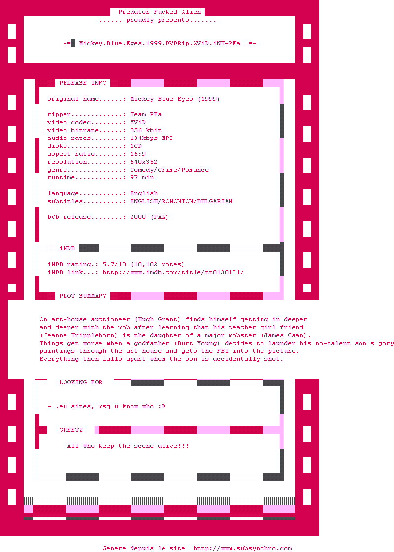 Y avez-vous pense ? Nous proposons déjà 1 sous-titre pour le film Mickey les yeux bleus. Avez-vous essaye de voir si ces sous-titres etaient compatibles avec cette release ? On vous laisse le soin de tester cela pour nous et de contribuer au site en postant le sous-titre en cas de compatiblite constatee !