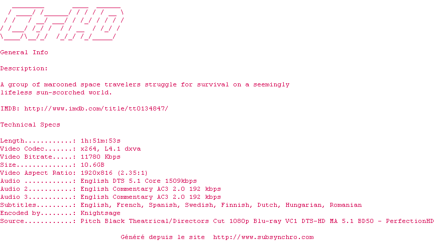 Y avez-vous pense ? Nous proposons déjà 9 sous-titres pour le film Pitch Black. Avez-vous essaye de voir si ces sous-titres etaient compatibles avec cette release ? On vous laisse le soin de tester cela pour nous et de contribuer au site en postant le sous-titre en cas de compatiblite constatee !