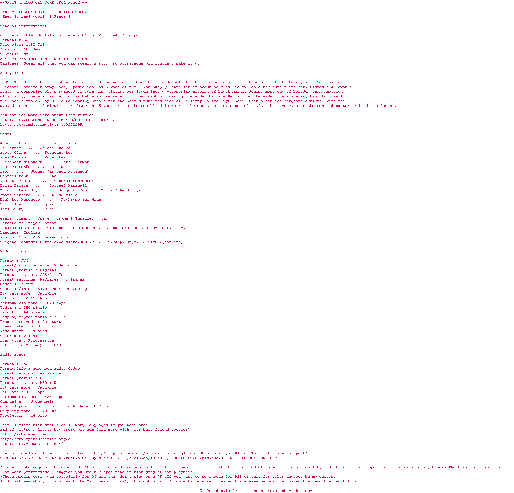 Buffalo.Soldiers.2001.HDTVRip.H264.AAC.Gopo_FR.srt Ajouté par SubSynchro Ajoute le 17-07-2014 23:15:28 Format : SRT Italique : Oui Taille : 0.00Ko Telechargement : 66 Merci àjch197774 Ajouter cette release à ma collection en cas de telechargement des sous-titres 0 0 0 Telecharger le ZiP contenant NFO, Affiche, Sous-titre (*.srt) Commentez le fichier Buffalo.Soldiers.2001.HDTVRip.H264.AAC.Gopo_FR.srt Commentez le fichier Buffalo.Soldiers.2001.HDTVRip.H264.AAC.Gopo_FR.srt Commentez ce fichier Le fichier 1-1405631728.srt n'existe pas ! Telechargez le RSS « Fichier de la release Buffalo.Soldiers.2001.HDTVRip.H264.AAC-Gopo » Retour au film « Buffalo Soldiers »