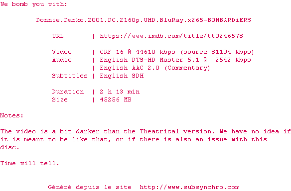 La release Donnie.Darko.2001.DC.2160p.UHD.BluRay.x265-B0MBARDiERS est en 4K