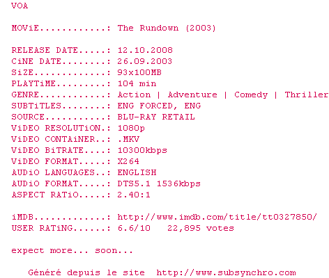 Synchro du sous-titre "the-rundown-2003-720p-hddvd-x264-septic-bitonio6"