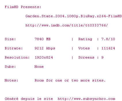 Y avez-vous pense ? Nous proposons déjà 6 sous-titres pour le film Garden State. Avez-vous essaye de voir si ces sous-titres etaient compatibles avec cette release ? On vous laisse le soin de tester cela pour nous et de contribuer au site en postant le sous-titre en cas de compatiblite constatee !