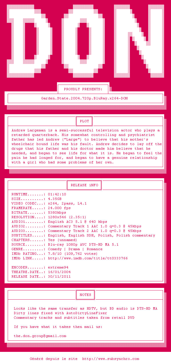 Garden.State.2004.720p.BluRay.x264-DON.srt Ce fichier a été testé et validé par Seijmo Ajouté par Seijmo Ajoute le 12-02-2012 19:07:47 Format : SRT Italique : Non Taille : 0.00Ko Telechargement : 170 Testé par le membre Ajouter cette release à ma collection en cas de telechargement des sous-titres 0 0 0 Telecharger le ZiP contenant NFO, Affiche, Sous-titre (*.srt) Commentez le fichier Garden.State.2004.720p.BluRay.x264-DON.srt Commentez le fichier Garden.State.2004.720p.BluRay.x264-DON.srt Commentez ce fichier Le fichier 408-1329070067.srt n'existe pas ! Telechargez le RSS « Fichier de la release Garden.State.2004.720p.BluRay.x264-DON » Retour au film « Garden State »