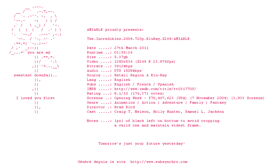 The.Incredibles.2004.720p.BluRay.X264-AMIABLE.fre.srt Ajouté par SubSynchro Ajoute le 02-04-2011 01:41:37 Format : SRT Italique : Non Taille : 0.00Ko Telechargement : 720 Merci àspaceboy74 Ajouter cette release à ma collection en cas de telechargement des sous-titres 0 0 0 Telecharger le ZiP contenant NFO, Affiche, Sous-titre (*.srt) Commentez le fichier The.Incredibles.2004.720p.BluRay.X264-AMIABLE.fre.srt Commentez le fichier The.Incredibles.2004.720p.BluRay.X264-AMIABLE.fre.srt Commentez ce fichier Le fichier 1-1301701338.srt n'existe pas ! Telechargez le RSS « Fichier de la release The.Incredibles.2004.720p.BluRay.x264-AMIABLE » Retour au film « Les Indestructibles »