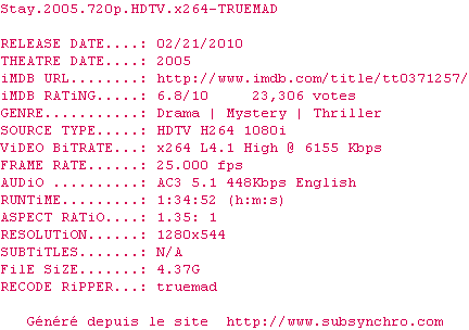 Stay.2005.720p.HDTV.x264-TRUEMAD.srt Ajouté par Ultimhate Ajoute le 16-08-2011 02:33:47 Format : SRT Italique : Non Taille : 0.00Ko Telechargement : 89 Sous-titre Extrait d'un DVD Z2 Ajouter cette release à ma collection en cas de telechargement des sous-titres 0 0 0 Telecharger le ZiP contenant NFO, Affiche, Sous-titre (*.srt) Commentez le fichier Stay.2005.720p.HDTV.x264-TRUEMAD.srt Commentez le fichier Stay.2005.720p.HDTV.x264-TRUEMAD.srt Commentez ce fichier Le fichier 138-1313454846.srt n'existe pas ! Telechargez le RSS « Fichier de la release Stay.2005.720p.HDTV.x264-TRUEMAD » Retour a la release « Stay.2005.720p.HDTV.x264-TRUEMAD »