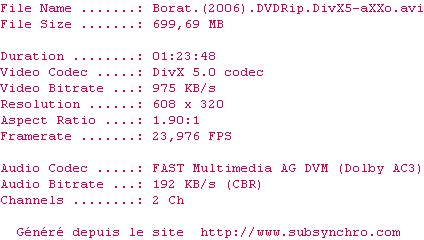 Borat.2006.DVDRip.AC3-aXXo.srt Ajouté par Ultimhate Ajoute le 22-07-2010 02:07:31 Format : SRT Italique : Non Taille : 0.00Ko Telechargement : 215 Ajouter cette release à ma collection en cas de telechargement des sous-titres 0 0 0 Telecharger le ZiP contenant NFO, Affiche, Sous-titre (*.srt) Commentez le fichier Borat.2006.DVDRip.AC3-aXXo.srt Commentez le fichier Borat.2006.DVDRip.AC3-aXXo.srt Commentez ce fichier Le fichier 138-1279757271.srt n'existe pas ! Telechargez le RSS « Fichier de la release Borat.2006.DVDRip.AC3-aXXo » Retour au film « Borat : Leçons culturelles sur l'Amérique au profit glorieuse nation Kazakhstan »