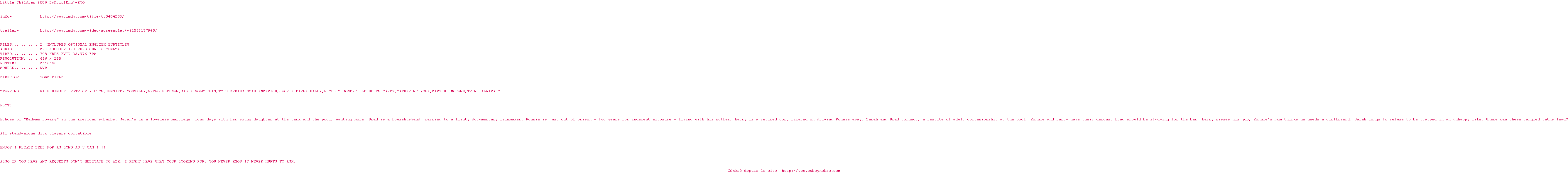 Little-Children-2006-DvDrip-RTO.srt Ajouté par Polochon Ajoute le 05-12-2011 22:01:17 Format : SRT Italique : Non Taille : 0.00Ko Telechargement : 159 Ajouter cette release à ma collection en cas de telechargement des sous-titres 0 0 0 Telecharger le ZiP contenant NFO, Affiche, Sous-titre (*.srt) Commentez le fichier Little-Children-2006-DvDrip-RTO.srt Commentez le fichier Little-Children-2006-DvDrip-RTO.srt Commentez ce fichier Le fichier 1697-1323118877.srt n'existe pas ! Telechargez le RSS « Fichier de la release Little.Children.2006.DvDrip-RTO » Retour a la release « Little.Children.2006.DvDrip-RTO »