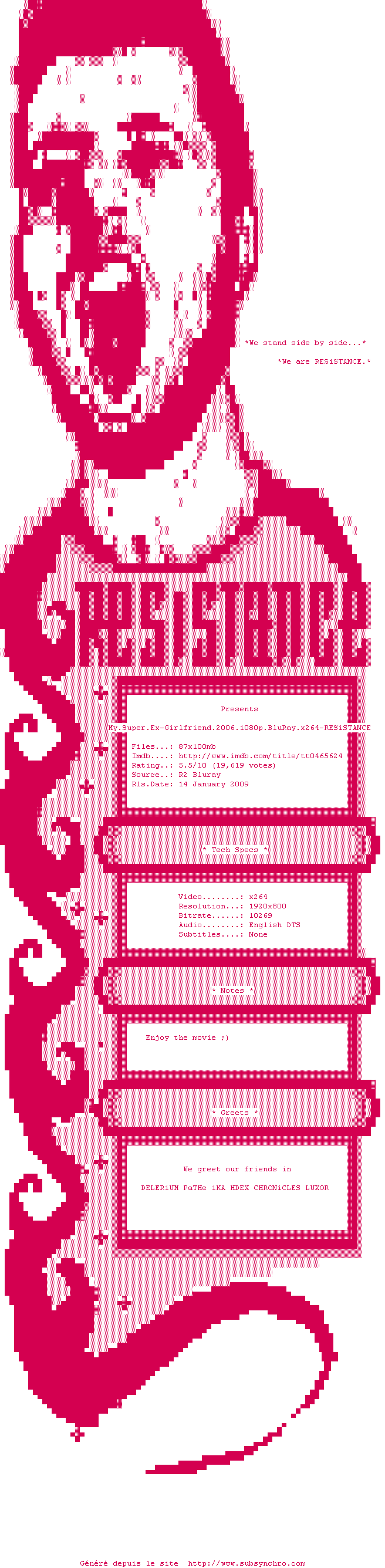 My.Super.Ex.Girlfriend.2006.1080p.BluRay.x264-RESiSTANCE.srt Ajouté par XeiS Ajoute le 31-01-2010 19:14:08 Format : SRT Italique : Non Taille : 0.00Ko Telechargement : 85 Ajouter cette release à ma collection en cas de telechargement des sous-titres 0 0 0 Telecharger le ZiP contenant NFO, Affiche, Sous-titre (*.srt) Commentez le fichier My.Super.Ex.Girlfriend.2006.1080p.BluRay.x264-RESiSTANCE.srt Commentez le fichier My.Super.Ex.Girlfriend.2006.1080p.BluRay.x264-RESiSTANCE.srt Commentez ce fichier Le fichier 52-1264961648.srt n'existe pas ! Telechargez le RSS « Fichier de la release My.Super.Ex.Girlfriend.2006.1080p.BluRay.x264-RESiSTANCE » Retour au film « Ma super ex »