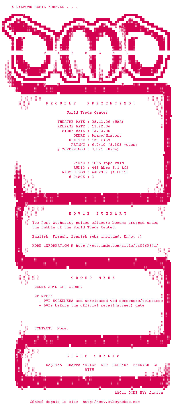 World.Trade.Center.DVDRip.XviD-DiAMOND.zip Ajouté par XeiS Ajoute le 15-07-2010 22:46:01 Format : ZIP Italique : Non Taille : 0.00Ko Telechargement : 37 Le fichier 52-1279226761.zip n'existe pas ! Ajouter cette release à ma collection en cas de telechargement des sous-titres 0 0 0 Telecharger le ZiP contenant NFO, Affiche, Sous-titre (*.zip) Commentez le fichier World.Trade.Center.DVDRip.XviD-DiAMOND.zip Commentez le fichier World.Trade.Center.DVDRip.XviD-DiAMOND.zip Commentez ce fichier Le fichier 52-1279226761.zip n'existe pas ! Telechargez le RSS « Fichier de la release World.Trade.Center.DVDRip.XviD-DiAMOND » Retour au film « World Trade Center »