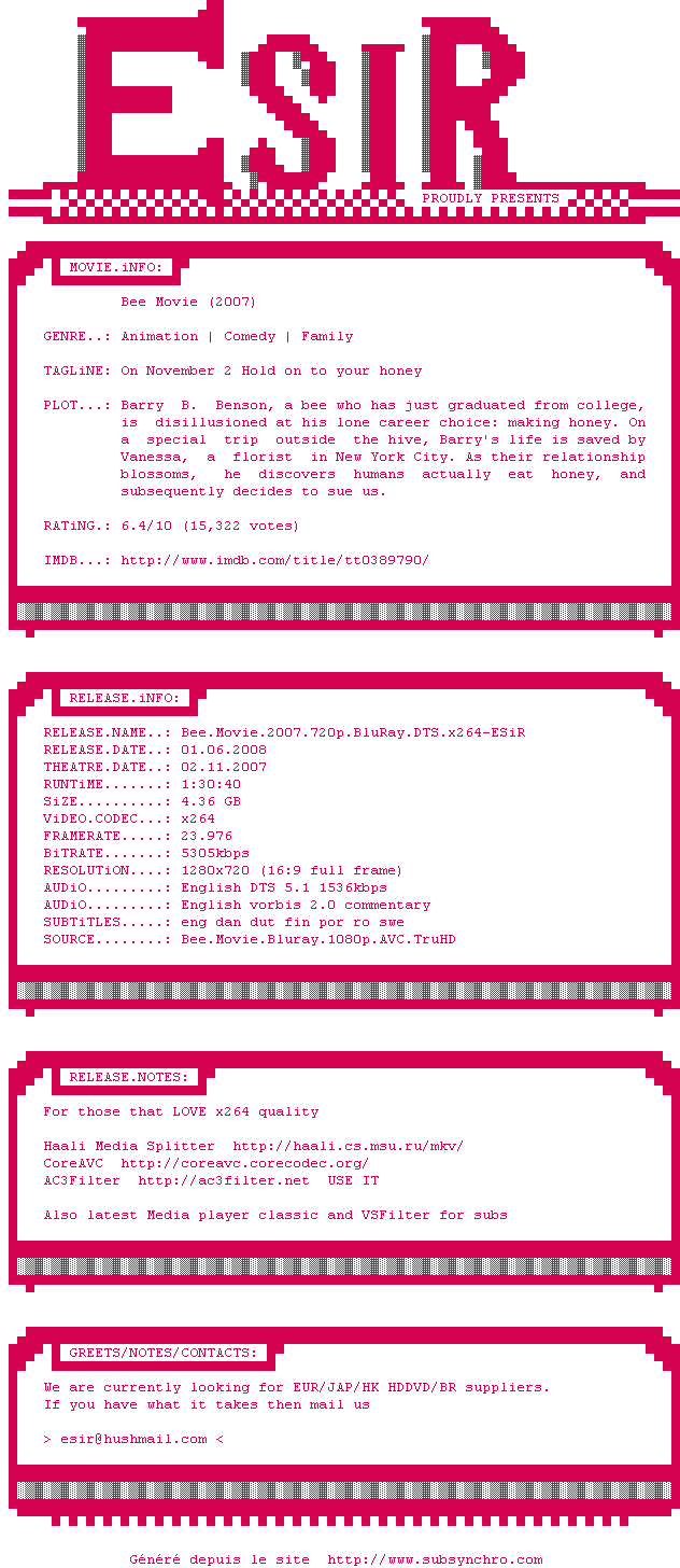 Bee.Movie.2007.1080p.BluRay.DTS.x264-ESiR.srt Ajouté par Ultimhate Ajoute le 21-07-2010 02:57:05 Format : SRT Italique : Non Taille : 0.00Ko Telechargement : 99 Ajouter cette release à ma collection en cas de telechargement des sous-titres 0 0 0 Telecharger le ZiP contenant NFO, Affiche, Sous-titre (*.srt) Commentez le fichier Bee.Movie.2007.1080p.BluRay.DTS.x264-ESiR.srt Commentez le fichier Bee.Movie.2007.1080p.BluRay.DTS.x264-ESiR.srt Commentez ce fichier Le fichier 138-1279673849.srt n'existe pas ! Telechargez le RSS « Fichier de la release Bee.Movie.2007.720p.BluRay.DTS.x264-ESiR » Retour au film « Bee Movie : Drôle d'abeille »