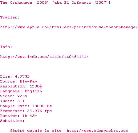 El.Orfanato.2007.DSP.Chakra.srt Ajouté par Ultimhate Ajoute le 26-07-2010 20:00:05 Format : SRT Italique : Non Taille : 0.00Ko Telechargement : 134 Ajouter cette release à ma collection en cas de telechargement des sous-titres 0 0 0 Telecharger le ZiP contenant NFO, Affiche, Sous-titre (*.srt) Commentez le fichier El.Orfanato.2007.DSP.Chakra.srt Commentez le fichier El.Orfanato.2007.DSP.Chakra.srt Commentez ce fichier Le fichier 138-1280167229.srt n'existe pas ! Telechargez le RSS « Fichier de la release The.Orphanage.SUBBED.720p.Bluray.x264-Chakra » Retour au film « L'Orphelinat »