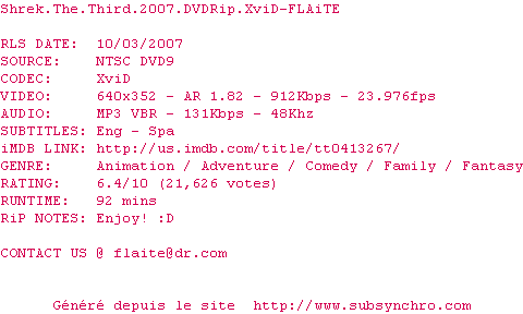Shrek.The.Third.2007.DVDRip.XviD-FLAiTE.srt Ajouté par XeiS Ajoute le 10-06-2010 05:48:08 Format : SRT Italique : Non Taille : 0.00Ko Telechargement : 81 Ajouter cette release à ma collection en cas de telechargement des sous-titres 0 0 0 Telecharger le ZiP contenant NFO, Affiche, Sous-titre (*.srt) Commentez le fichier Shrek.The.Third.2007.DVDRip.XviD-FLAiTE.srt Commentez le fichier Shrek.The.Third.2007.DVDRip.XviD-FLAiTE.srt Commentez ce fichier Le fichier 52-1276141688.srt n'existe pas ! Telechargez le RSS « Fichier de la release Shrek.The.Third.2007.DVDRip.XviD-FLAiTE » Retour au film « Shrek le troisième »