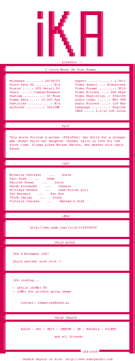 I.Could.Never.Be.Your.Woman.2007.DVDRiP.XViD-iKA.srt Ajouté par Creex Ajoute le 21-02-2011 20:14:53 Format : SRT Italique : Non Taille : 0.00Ko Telechargement : 120 Sous-titre Extrait d'un DVD Z2 Merci FwD :) Ajouter cette release à ma collection en cas de telechargement des sous-titres 0 0 0 Telecharger le ZiP contenant NFO, Affiche, Sous-titre (*.srt) Commentez le fichier I.Could.Never.Be.Your.Woman.2007.DVDRiP.XViD-iKA.srt Commentez le fichier I.Could.Never.Be.Your.Woman.2007.DVDRiP.XViD-iKA.srt Commentez ce fichier Le fichier 1369-1298315693.srt n'existe pas ! Telechargez le RSS « Fichier de la release I.Could.Never.Be.Your.Woman.2007.DVDRiP.XViD-iKA » Retour au film « Trop jeune pour elle ! »