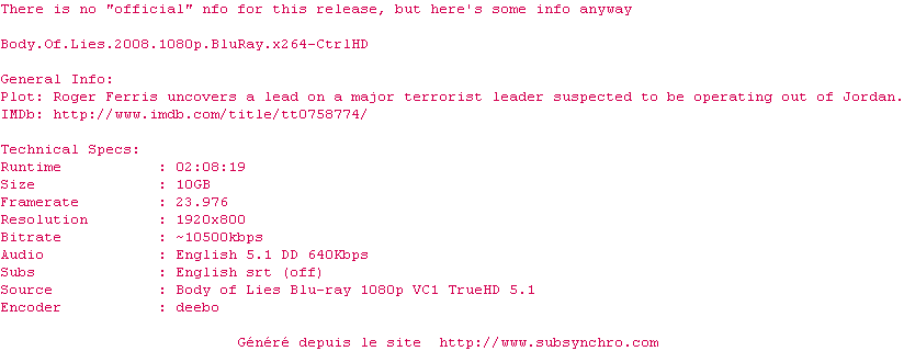 Body.Of.Lies.2008.1080p.BluRay.x264-CtrlHD.srt Ajouté par XeiS Ajoute le 16-01-2010 10:11:49 Format : SRT Italique : Non Taille : 0.00Ko Telechargement : 115 Ajouter cette release à ma collection en cas de telechargement des sous-titres 0 0 0 Telecharger le ZiP contenant NFO, Affiche, Sous-titre (*.srt) Commentez le fichier Body.Of.Lies.2008.1080p.BluRay.x264-CtrlHD.srt Commentez le fichier Body.Of.Lies.2008.1080p.BluRay.x264-CtrlHD.srt Commentez ce fichier Le fichier 52-1263633109.srt n'existe pas ! Telechargez le RSS « Fichier de la release Body.Of.Lies.2008.1080p.BluRay.x264-CtrlHD » Retour au film « Mensonges d'État »