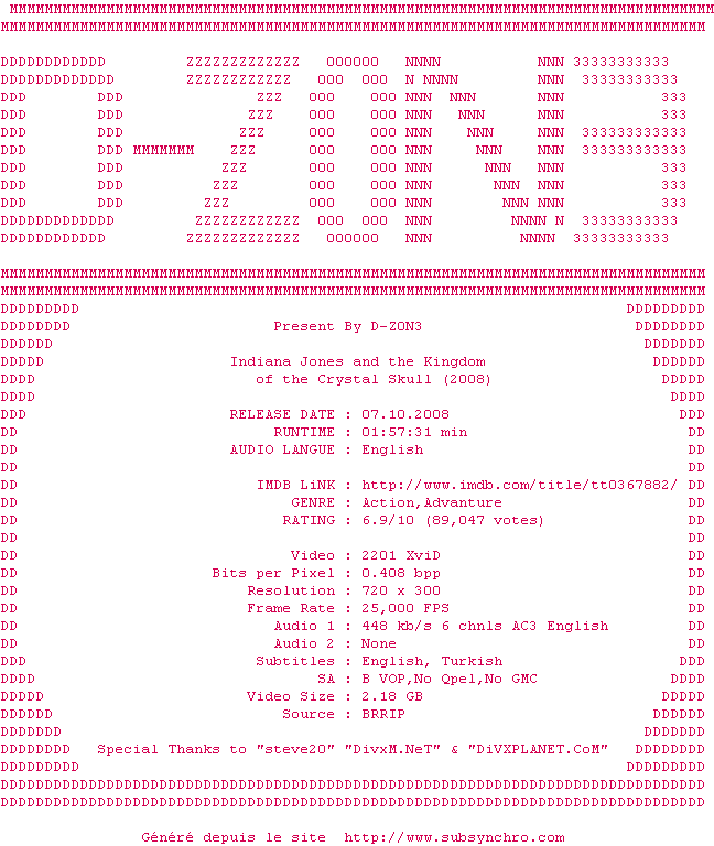 Indiana.Jones.And.The.Kingdom.Of.The.Crystal.Skull.2008.BRRip.AC3.Xvid.D-Z0N3.srt Ajouté par XeiS Ajoute le 26-03-2010 23:00:17 Format : SRT Italique : Non Taille : 0.00Ko Telechargement : 86 Ajouter cette release à ma collection en cas de telechargement des sous-titres 0 0 0 Telecharger le ZiP contenant NFO, Affiche, Sous-titre (*.srt) Commentez le fichier Indiana.Jones.And.The.Kingdom.Of.The.Crystal.Skull.2008.BRRip.AC3.Xvid.D-Z0N3.srt Commentez le fichier Indiana.Jones.And.The.Kingdom.Of.The.Crystal.Skull.2008.BRRip.AC3.Xvid.D-Z0N3.srt Commentez ce fichier Le fichier 52-1269640817.srt n'existe pas ! Telechargez le RSS « Fichier de la release Indiana.Jones.And.The.Kingdom.Of.The.Crystal.Skull.2008.BRRip.AC3.Xvid-D-Z0N3 » Retour au film « Indiana Jones et le Royaume du Crâne de Cristal »