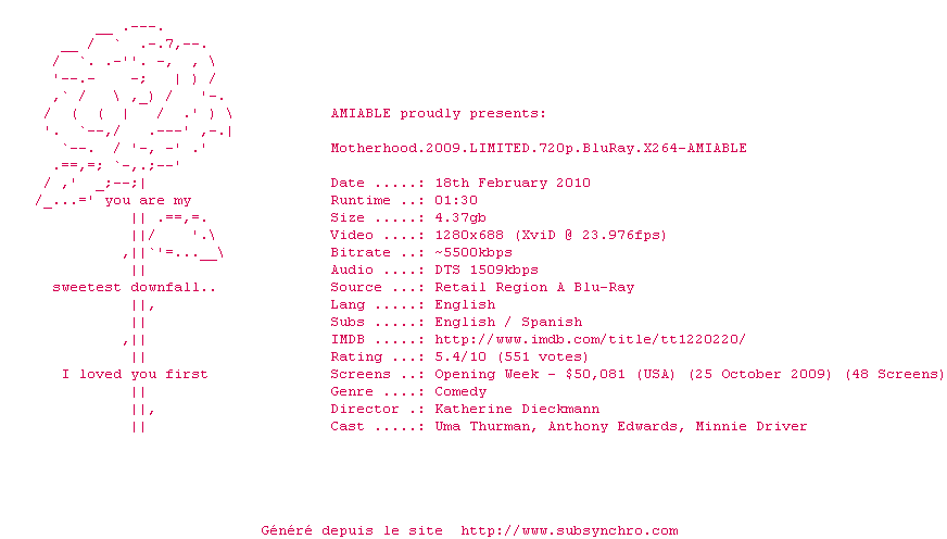 Motherhood.2009.LIMITED.720p.BluRay.X264-AMIABLE.srt Ajouté par XeiS Ajoute le 01-11-2010 13:52:02 Format : SRT Italique : Non Taille : 0.00Ko Telechargement : 46 Ajouter cette release à ma collection en cas de telechargement des sous-titres 0 0 0 Telecharger le ZiP contenant NFO, Affiche, Sous-titre (*.srt) Commentez le fichier Motherhood.2009.LIMITED.720p.BluRay.X264-AMIABLE.srt Commentez le fichier Motherhood.2009.LIMITED.720p.BluRay.X264-AMIABLE.srt Commentez ce fichier Le fichier 52-1288615922.srt n'existe pas ! Telechargez le RSS « Fichier de la release Motherhood.2009.LIMITED.720p.BluRay.X264-AMIABLE » Retour au film « Maman mode d'emploi »