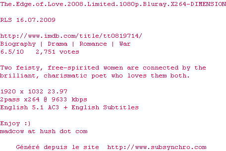 The.Edge.of.Love.2008.Limited.1080p.Bluray.X264-DIMENSION.srt Ajouté par Inco Ajoute le 07-05-2010 13:49:36 Format : SRT Italique : Non Taille : 0.00Ko Telechargement : 108 Ajouter cette release à ma collection en cas de telechargement des sous-titres 0 0 0 Telecharger le ZiP contenant NFO, Affiche, Sous-titre (*.srt) Commentez le fichier The.Edge.of.Love.2008.Limited.1080p.Bluray.X264-DIMENSION.srt Commentez le fichier The.Edge.of.Love.2008.Limited.1080p.Bluray.X264-DIMENSION.srt Commentez ce fichier Le fichier 437-1273232976.srt n'existe pas ! Telechargez le RSS « Fichier de la release The.Edge.of.Love.2008.Limited.1080p.Bluray.x264-DIMENSION » Retour au film « The Edge of Love »