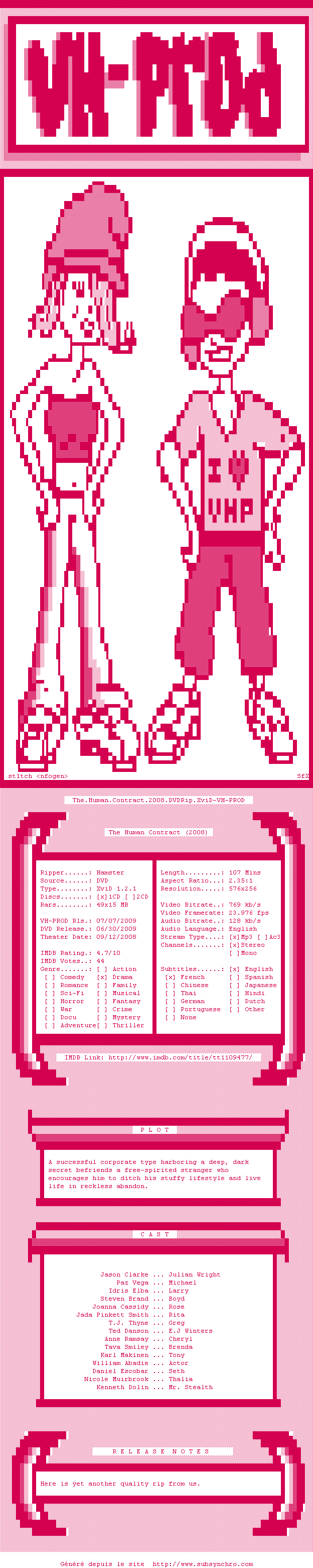The.Human.Contract.2008.Z1.VH-PROD.FR.srt Ajouté par Ultimhate Ajoute le 27-07-2010 23:19:33 Format : SRT Italique : Non Taille : 0.00Ko Telechargement : 53 Ajouter cette release à ma collection en cas de telechargement des sous-titres 0 0 0 Telecharger le ZiP contenant NFO, Affiche, Sous-titre (*.srt) Commentez le fichier The.Human.Contract.2008.Z1.VH-PROD.FR.srt Commentez le fichier The.Human.Contract.2008.Z1.VH-PROD.FR.srt Commentez ce fichier Le fichier 138-1280265593.srt n'existe pas ! Telechargez le RSS « Fichier de la release The.Human.Contract.2008.DVDRip.XviD-VH-PROD » Retour a la release « The.Human.Contract.2008.DVDRip.XviD-VH-PROD »
