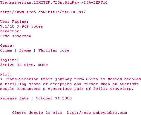 t-septic.fre.srt Ajouté par SubSynchro Ajoute le 11-07-2010 01:09:33 Format : SRT Italique : Non Taille : 0.00Ko Telechargement : 154 Ajouter cette release à ma collection en cas de telechargement des sous-titres 0 0 0 Telecharger le ZiP contenant NFO, Affiche, Sous-titre (*.srt) Commentez le fichier t-septic.fre.srt Commentez le fichier t-septic.fre.srt Commentez ce fichier Le fichier 1-1278803400.srt n'existe pas ! Telechargez le RSS « Fichier de la release Transsiberian.LIMITED.720p.BluRay.x264-SEPTiC » Retour a la release « Transsiberian.LIMITED.720p.BluRay.x264-SEPTiC »