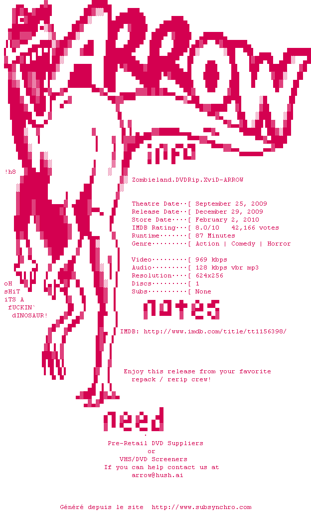 arw-zombieland.srt Ajouté par SubSynchro Ajoute le 30-12-2009 10:21:38 Format : SRT Italique : Oui Taille : 0.00Ko Telechargement : 501 Sous-titre Extrait d'un DVD Z2 Ajouter cette release à ma collection en cas de telechargement des sous-titres 0 0 0 Telecharger le ZiP contenant NFO, Affiche, Sous-titre (*.srt) Commentez le fichier arw-zombieland.srt Commentez le fichier arw-zombieland.srt Commentez ce fichier Le fichier 1-1262164914.srt n'existe pas ! Telechargez le RSS « Fichier de la release Zombieland.DVDRip.XviD-ARROW » Retour au film « Bienvenue à  Zombieland »