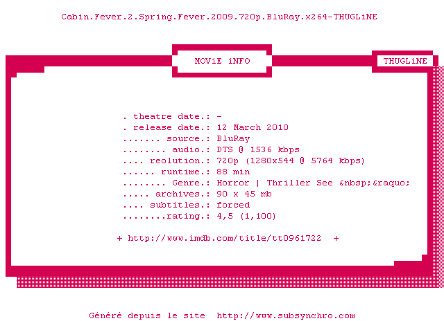 Cabin.Fever.2.Spring.Fever.2009.720p.BluRay.x264-THUGLiNE.srt Ajouté par Ultimhate Ajoute le 11-01-2011 13:55:46 Format : SRT Italique : Non Taille : 0.00Ko Telechargement : 162 Sous-titre Extrait d'un DVD Z2 Ajouter cette release à ma collection en cas de telechargement des sous-titres 0 0 0 Telecharger le ZiP contenant NFO, Affiche, Sous-titre (*.srt) Commentez le fichier Cabin.Fever.2.Spring.Fever.2009.720p.BluRay.x264-THUGLiNE.srt Commentez le fichier Cabin.Fever.2.Spring.Fever.2009.720p.BluRay.x264-THUGLiNE.srt Commentez ce fichier Le fichier 138-1294750564.srt n'existe pas ! Telechargez le RSS « Fichier de la release Cabin.Fever.2.Spring.Fever.2009.720p.BluRay.x264-THUGLiNE » Retour au film « Cabin Fever 2 »