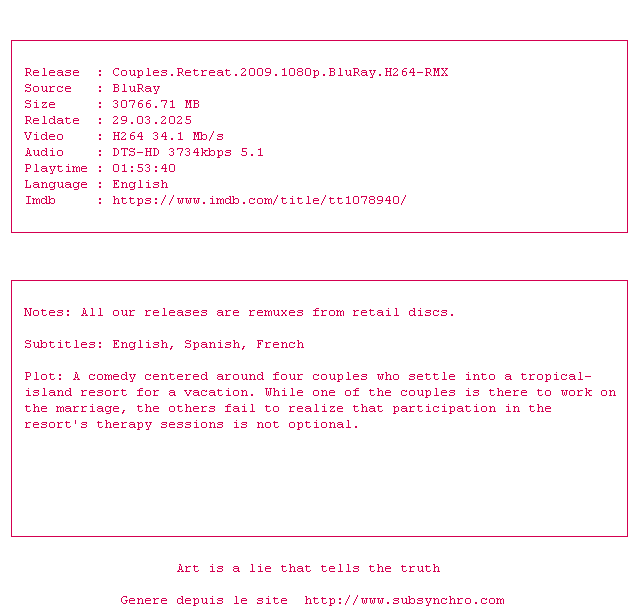 Y avez-vous pense ? Nous proposons déjà 9 sous-titres pour le film Thérapie de couples. Avez-vous essaye de voir si ces sous-titres etaient compatibles avec cette release ? On vous laisse le soin de tester cela pour nous et de contribuer au site en postant le sous-titre en cas de compatiblite constatee !