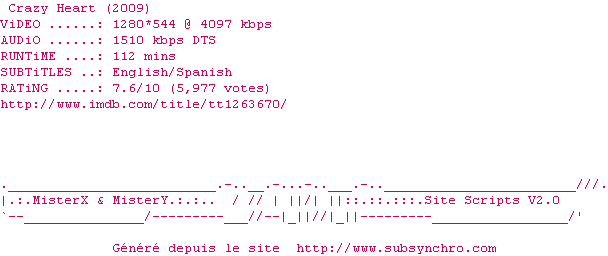 metis-cheart-720p.fre.srt Ajouté par SubSynchro Ajoute le 11-04-2010 22:42:33 Format : SRT Italique : Non Taille : 0.00Ko Telechargement : 315 Ajouter cette release à ma collection en cas de telechargement des sous-titres 0 0 0 Telecharger le ZiP contenant NFO, Affiche, Sous-titre (*.srt) Commentez le fichier metis-cheart-720p.fre.srt Commentez le fichier metis-cheart-720p.fre.srt Commentez ce fichier Le fichier 1-1271018638.srt n'existe pas ! Telechargez le RSS « Fichier de la release Crazy.Heart.2009.720p.BluRay.x264-METiS » Retour au film « Crazy Heart »