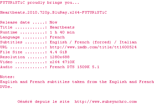 Heartbeats.2010.1080p.BluRay.x264-FUTURiSTiC.French.SDH.srt Ajouté par SubSynchro Ajoute le 10-03-2018 14:20:29 Format : SRT Italique : Oui Taille : 0.00Ko Telechargement : 31 Ajouter cette release à ma collection en cas de telechargement des sous-titres 0 0 0 Telecharger le ZiP contenant NFO, Affiche, Sous-titre (*.srt) Commentez le fichier Heartbeats.2010.1080p.BluRay.x264-FUTURiSTiC.French.SDH.srt Commentez le fichier Heartbeats.2010.1080p.BluRay.x264-FUTURiSTiC.French.SDH.srt Commentez ce fichier Le fichier 1-1520688029.srt n'existe pas ! Telechargez le RSS « Fichier de la release Heartbeats.2010.720p.BluRay.x264-FUTURiSTiC » Retour au film « Les Amours Imaginaires »