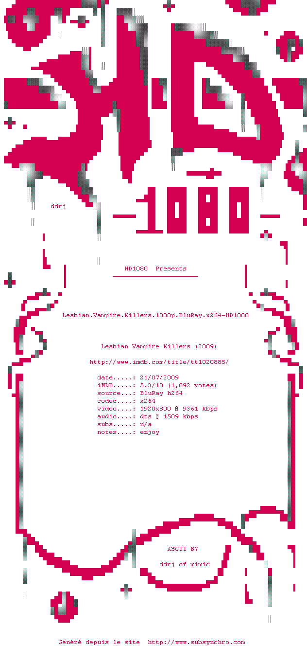 Lesbian.Vampire.Killers.1080p.BluRay.x264-HD1080.srt Ajouté par XeiS Ajoute le 11-02-2010 23:58:01 Format : SRT Italique : Non Taille : 0.00Ko Telechargement : 103 Ajouter cette release à ma collection en cas de telechargement des sous-titres 0 0 0 Telecharger le ZiP contenant NFO, Affiche, Sous-titre (*.srt) Commentez le fichier Lesbian.Vampire.Killers.1080p.BluRay.x264-HD1080.srt Commentez le fichier Lesbian.Vampire.Killers.1080p.BluRay.x264-HD1080.srt Commentez ce fichier Le fichier 52-1265929081.srt n'existe pas ! Telechargez le RSS « Fichier de la release Lesbian.Vampire.Killers.1080p.BluRay.x264-HD1080 » Retour au film « Lesbian Vampire Killers »