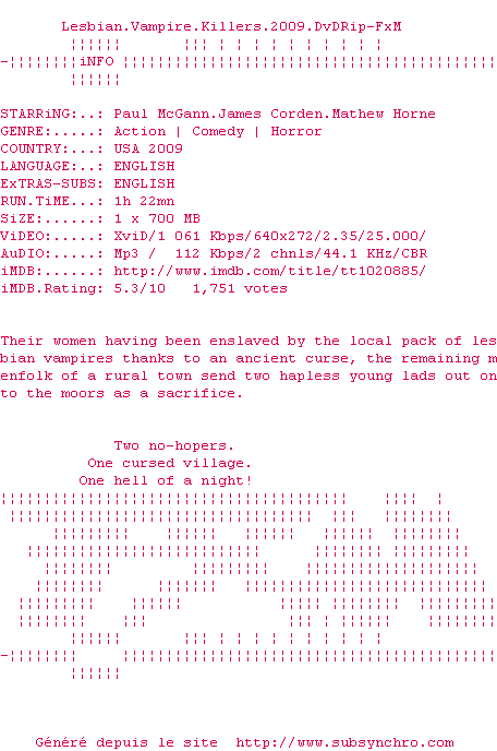Lesbian.Vampire.Killers.2009.DvDRip-FxM.srt Ajouté par SubSynchro Ajoute le 06-01-2010 18:45:36 Format : SRT Italique : Non Taille : 0.00Ko Telechargement : 144 Ajouter cette release à ma collection en cas de telechargement des sous-titres 0 0 0 Telecharger le ZiP contenant NFO, Affiche, Sous-titre (*.srt) Commentez le fichier Lesbian.Vampire.Killers.2009.DvDRip-FxM.srt Commentez le fichier Lesbian.Vampire.Killers.2009.DvDRip-FxM.srt Commentez ce fichier Le fichier 1-1262799948.srt n'existe pas ! Telechargez le RSS « Fichier de la release Lesbian.Vampire.Killers.2009.DvDRip-FxM » Retour au film « Lesbian Vampire Killers »