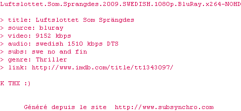 Y avez-vous pense ? Nous proposons déjà 6 sous-titres pour le film Millénium 3 - La Reine dans le palais des courants d'air. Avez-vous essaye de voir si ces sous-titres etaient compatibles avec cette release ? On vous laisse le soin de tester cela pour nous et de contribuer au site en postant le sous-titre en cas de compatiblite constatee !