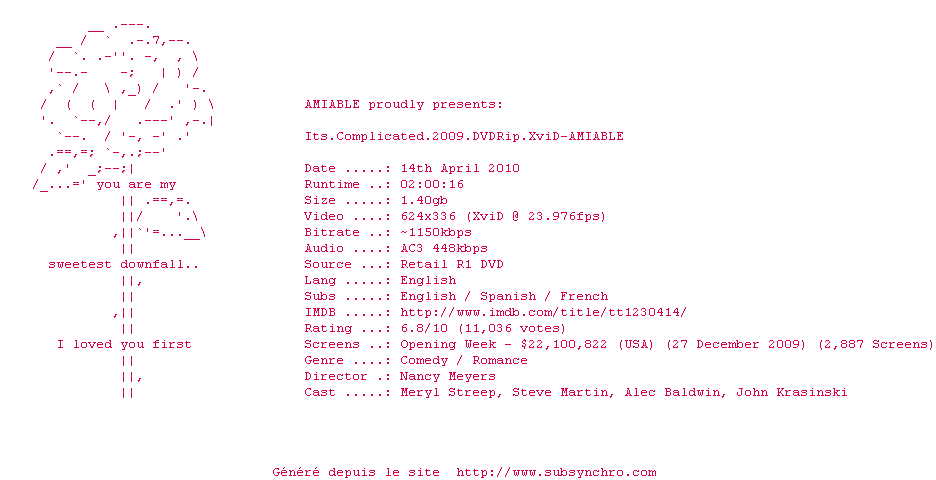 Its.Complicated.2009.Z1.AMiABLE.zip Ajouté par SubSynchro Ajoute le 15-04-2010 13:35:34 Format : ZIP Italique : Oui Taille : 0.00Ko Telechargement : 185 Le fichier 1-1271331429.zip n'existe pas ! Ajouter cette release à ma collection en cas de telechargement des sous-titres 0 0 0 Telecharger le ZiP contenant NFO, Affiche, Sous-titre (*.zip) Commentez le fichier Its.Complicated.2009.Z1.AMiABLE.zip Commentez le fichier Its.Complicated.2009.Z1.AMiABLE.zip Commentez ce fichier Le fichier 1-1271331429.zip n'existe pas ! Telechargez le RSS « Fichier de la release Its.Complicated.2009.DVDRip.XviD-AMIABLE » Retour au film « Pas si simple »