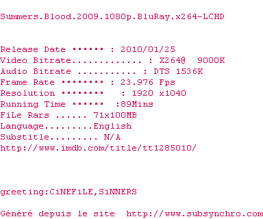 Telechargez le RSS « Fichier de la release Summers.Blood.2009.1080p.BluRay.x264-LCHD »