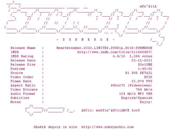 Y avez-vous pense ? Nous proposons déjà 3 sous-titres pour le film L'ArnacÅ“ur. Avez-vous essaye de voir si ces sous-titres etaient compatibles avec cette release ? On vous laisse le soin de tester cela pour nous et de contribuer au site en postant le sous-titre en cas de compatiblite constatee !