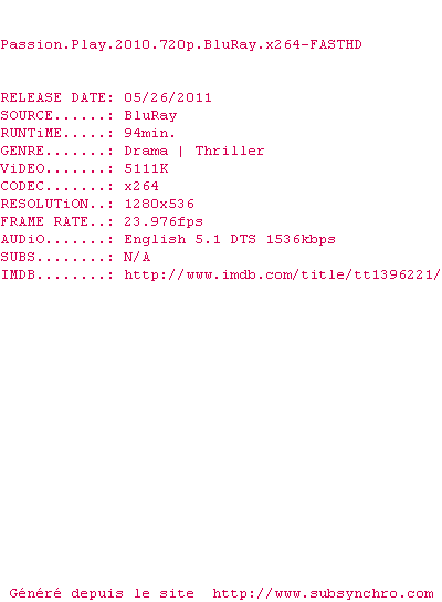 Y avez-vous pense ? Nous proposons déjà 1 sous-titre pour le film Passion Play. Avez-vous essaye de voir si ces sous-titres etaient compatibles avec cette release ? On vous laisse le soin de tester cela pour nous et de contribuer au site en postant le sous-titre en cas de compatiblite constatee !